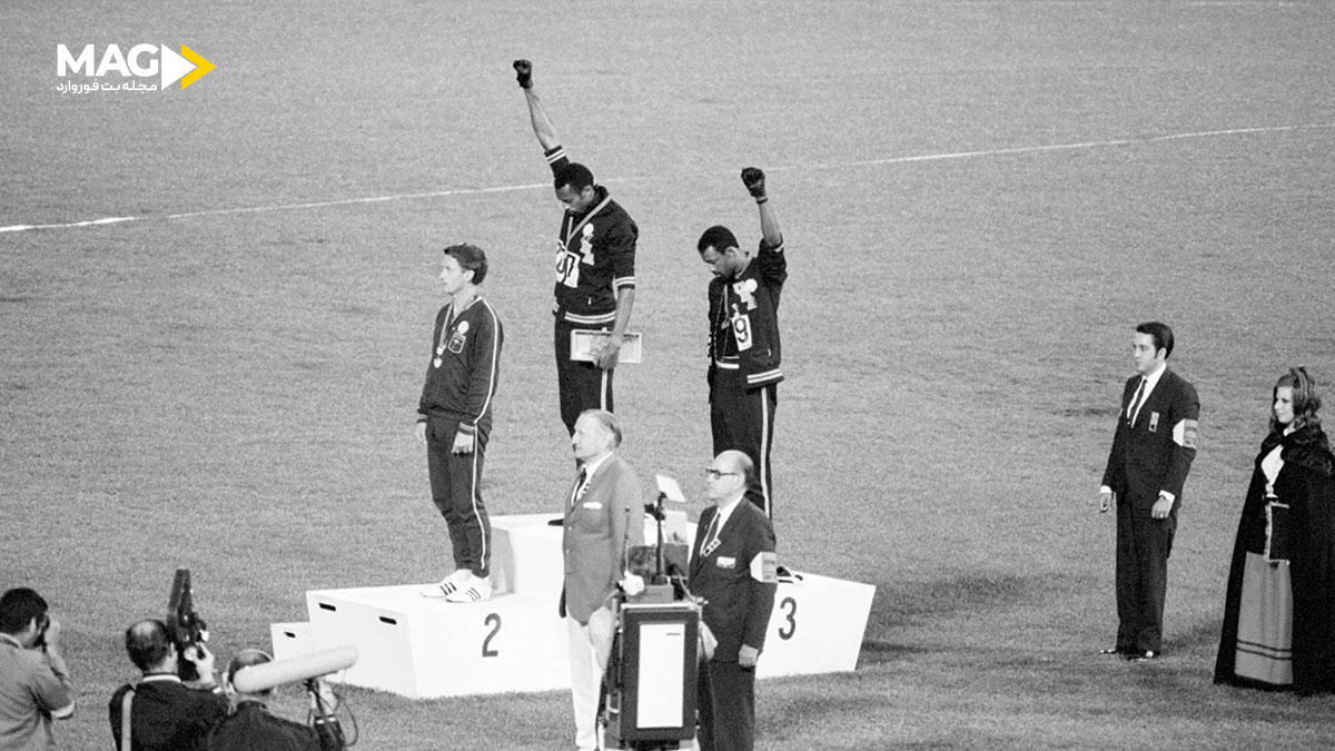 در المپیک ۱۹۶۸ مکزیکوسیتی، زمانی که جنبش حقوق مدنی در آمریکا در اوج بود، تامی اسمیت و جان کارلوس، قهرمانان دوی ۲۰۰ متر، از سکوی اهدای مدال بهعنوان تریبونی برای بیان اعتراض خود استفاده کردند. آنها با سرهای پایین، پاهای پابرهنه و یک دستکش سیاه، نمادی از قدرت و وحدت سیاهپوستان را به نمایش گذاشتند. این حرکت شجاعانه، با وجود پیامدهای سنگینی که برای آنها داشت (اخراج از المپیک و طردشدن از جامعه)، به یکی از قدرتمندترین بیانیههای سیاسی تاریخ ورزش تبدیل شد و الگویی برای ورزشکاران فعال اجتماعی در سالهای بعد شد.